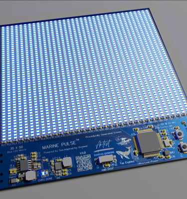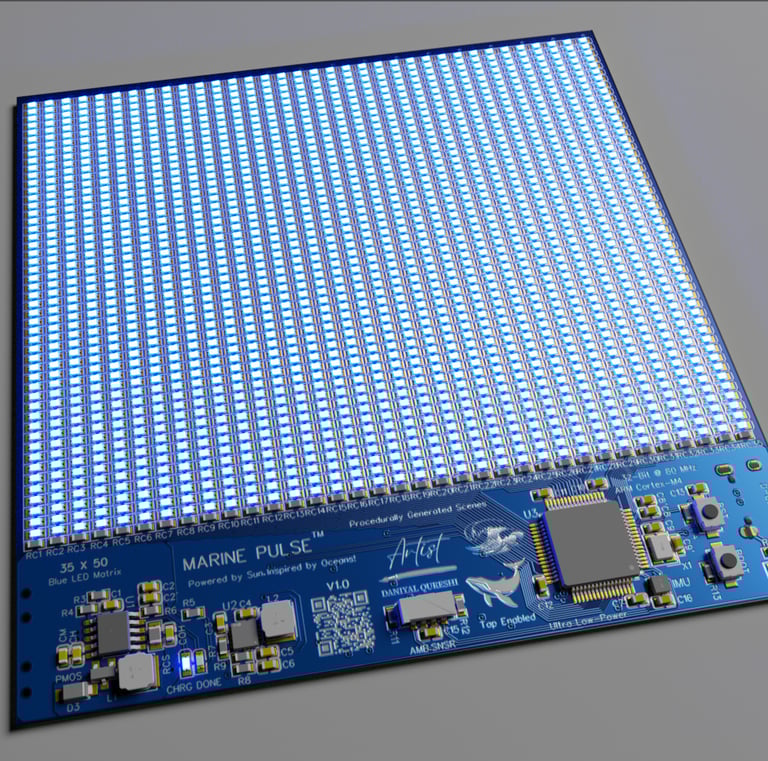 Marine Pulse is a unique solar-powered, standalone LED art piece featuring a 50×35 blue LED matrix with 8-bit depth, an onboard IMU for tap-based scene control, and powered by an ultra-low-power ARM Cortex-M0 (STM32). It marks my first step into Art-Tech fusion, running a custom procedural engine (Samudra, in development) to simulate dynamic ocean waves and a whale—entirely offline, with no external processing.